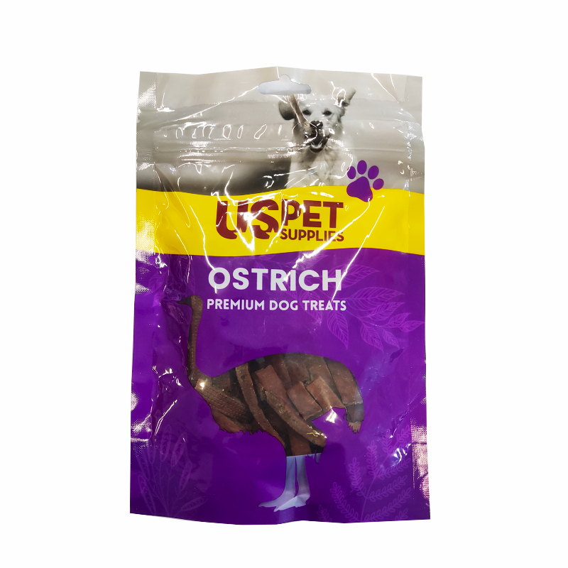 تشویقی سگ یو اس پت با گوشت شترمرغ و پنیر مدل نواری وزن 100 گرم