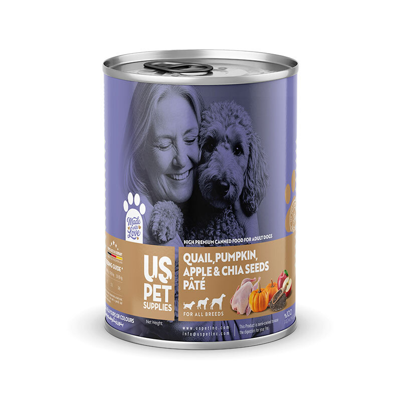 کنسرو غذای سگ یو اس پت مدل های پریمیوم با طعم بلدرچین، کدو تنبل، سیب و دانه چیا USPet Dog Canned Food وزن 800 گرم