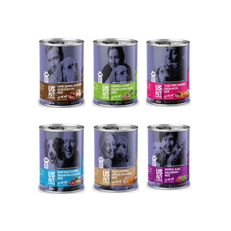 - کنسرو غذای سگ یو اس پت مدل های پریمیوم با طعم گوشت بره، سیرابی، کدوتنبل و روغن کنجد