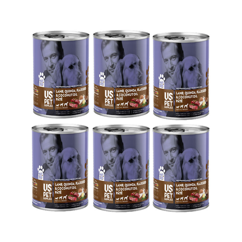 کنسرو غذای سگ یو اس پت مدل های پریمیوم با طعم گوشت بره، کینوآ، تخم کتان و روغن نارگیل USPet Dog Canned Food بسته 6 عددی