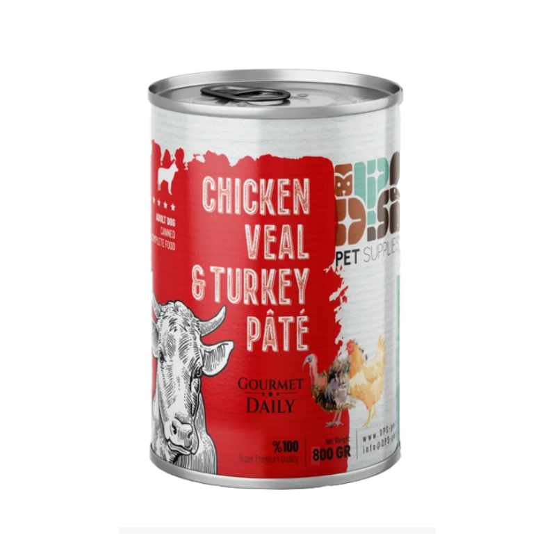 کنسرو سگ دی پی اس پته با طعم گوشت مرغ و گوساله و بوقلمون وزن 400 گرم