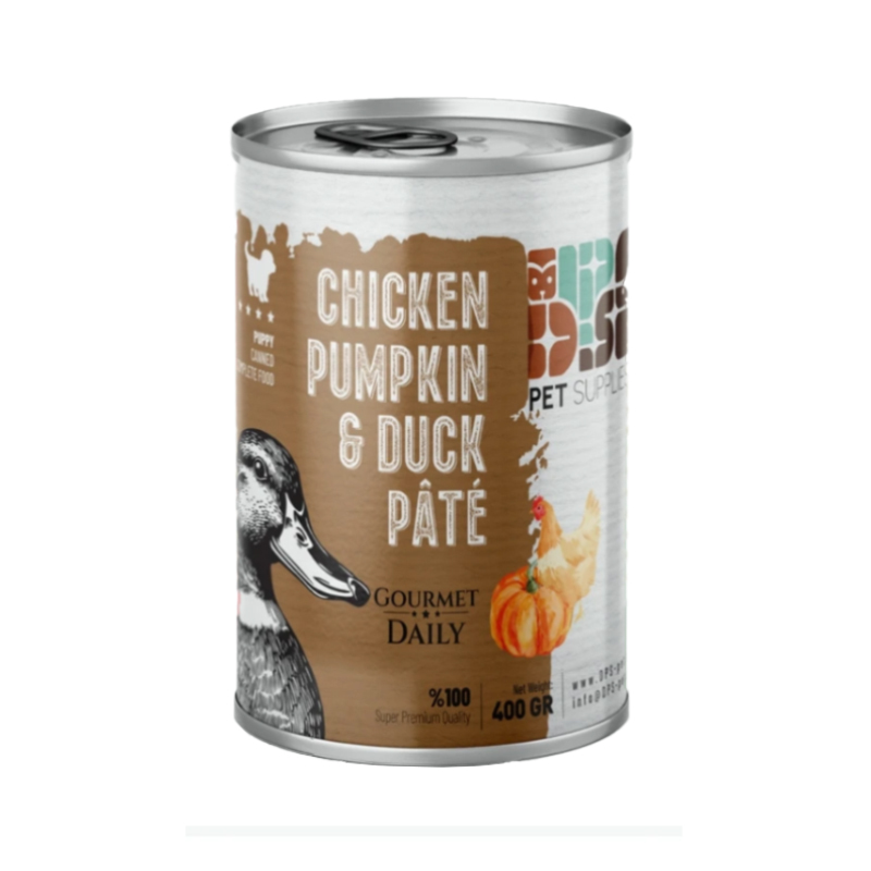کنسرو توله سگ دی پی اس مدل پته با طعم گوشت مرغ و اردک و کدو وزن 400 گرم