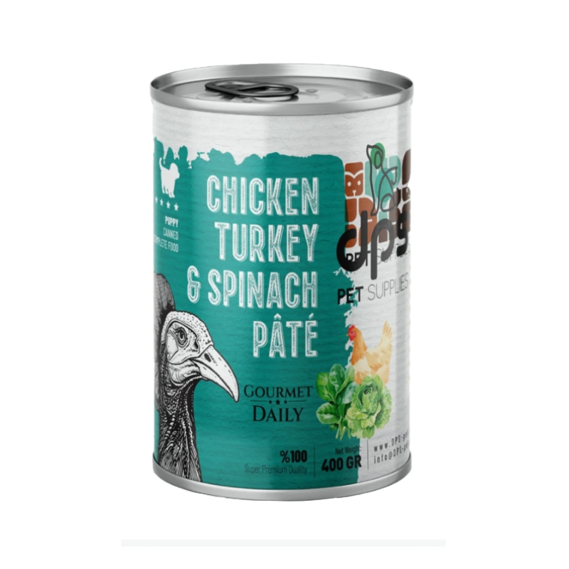 کنسرو توله سگ دی پی اس مدل پته با طعم گوشت مرغ و بوقلمون و اسفناج وزن 400 گرم