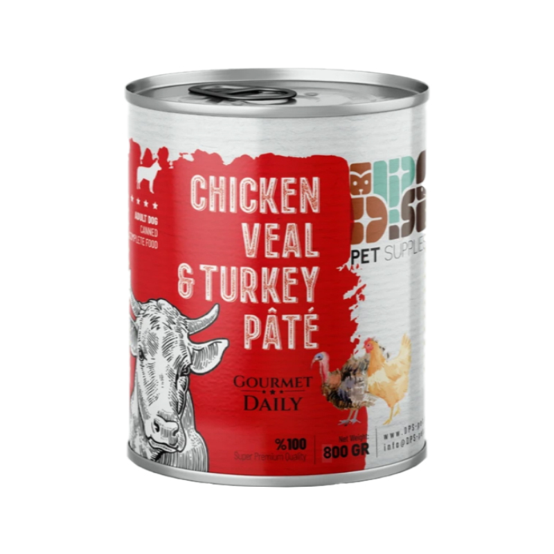 کنسرو سگ دی پی اس پته با طعم گوشت مرغ و گوساله و بوقلمون وزن 800 گرم