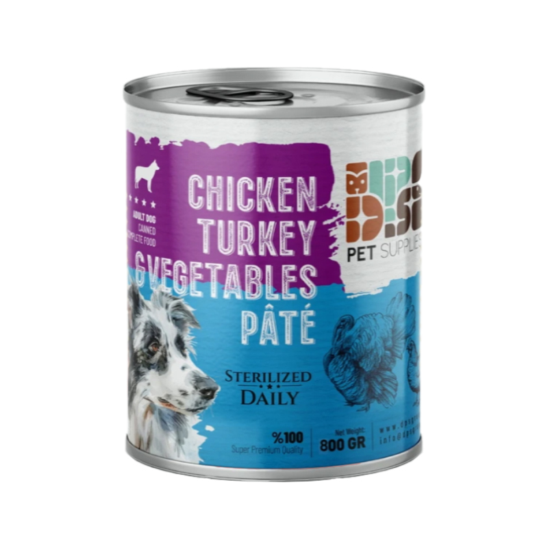 کنسرو سگ دی پی اس مدل پته با طعم گوشت مرغ و شترمرغ و سبزیجات وزن 800 گرم