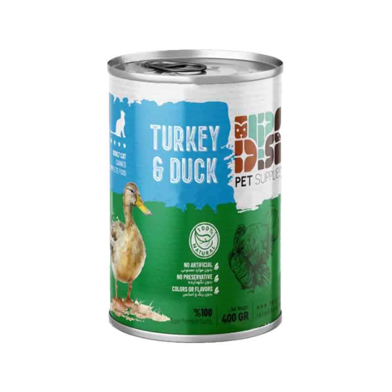 کنسرو گربه دی پی اس مدل نچرال با طعم گوشت بوقلمون و اردک وزن 400 گرم