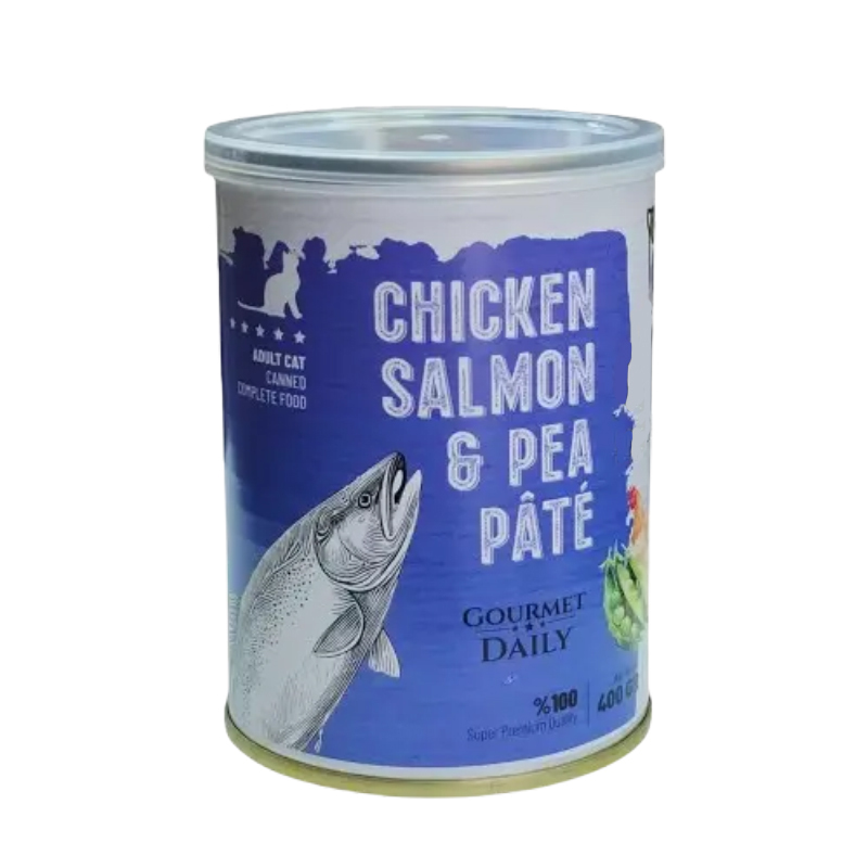 کنسرو گربه دی پی اس مدل پته با طعم گوشت مرغ و سالمون و نخود فرنگی وزن 400 گرم