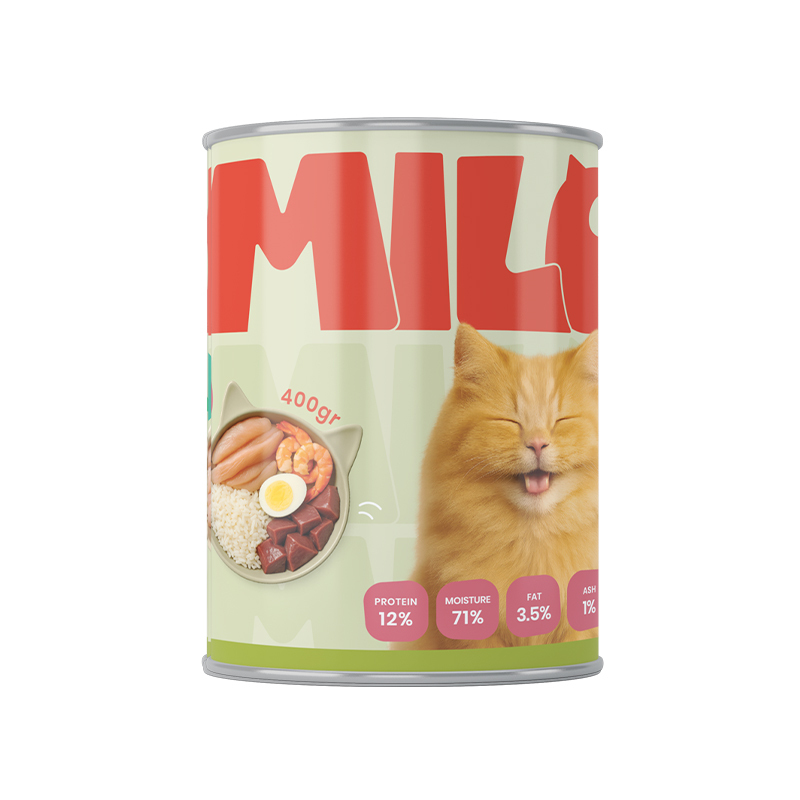 کنسرو گربه اومیلو مدل نچرال با طعم گوشت مرغ و میگو وزن 400 گرم