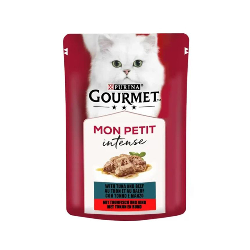 پوچ گربه گورمت با طعم ماهی تن و گوشت گاو در سس وزن 50 گرم
