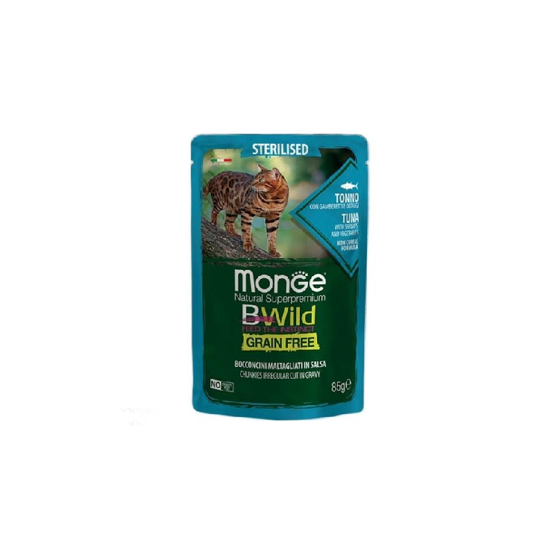 پوچ گربه عقیم شده مونژ مدل بی واید با طعم ماهی تن و میگو وزن 85 گرم