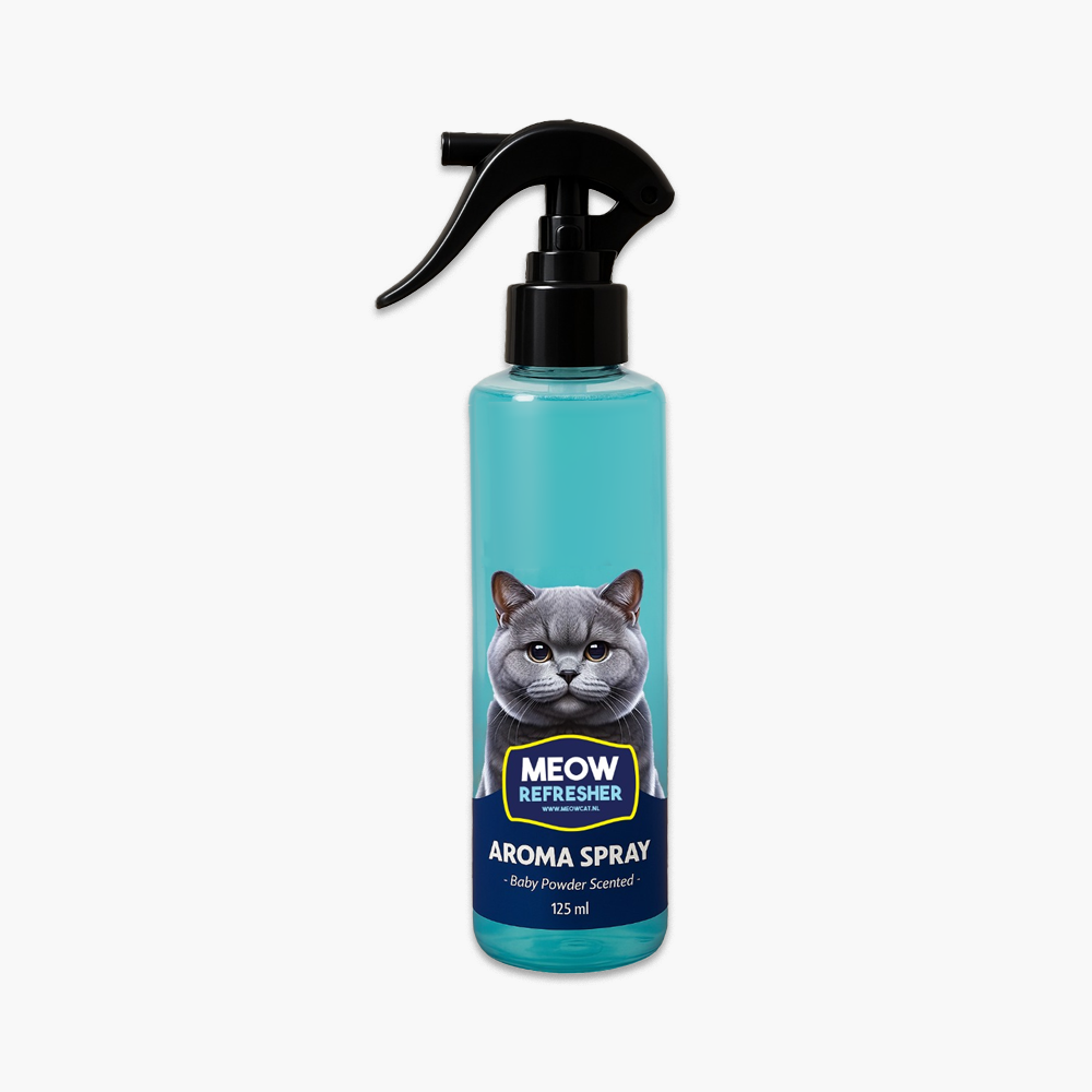 اسپری خوشبو کننده ظرف خاک گربه میوکت با رایحه پودر بچه Meocat Deodorant Spray حجم 125 میلی لیتر