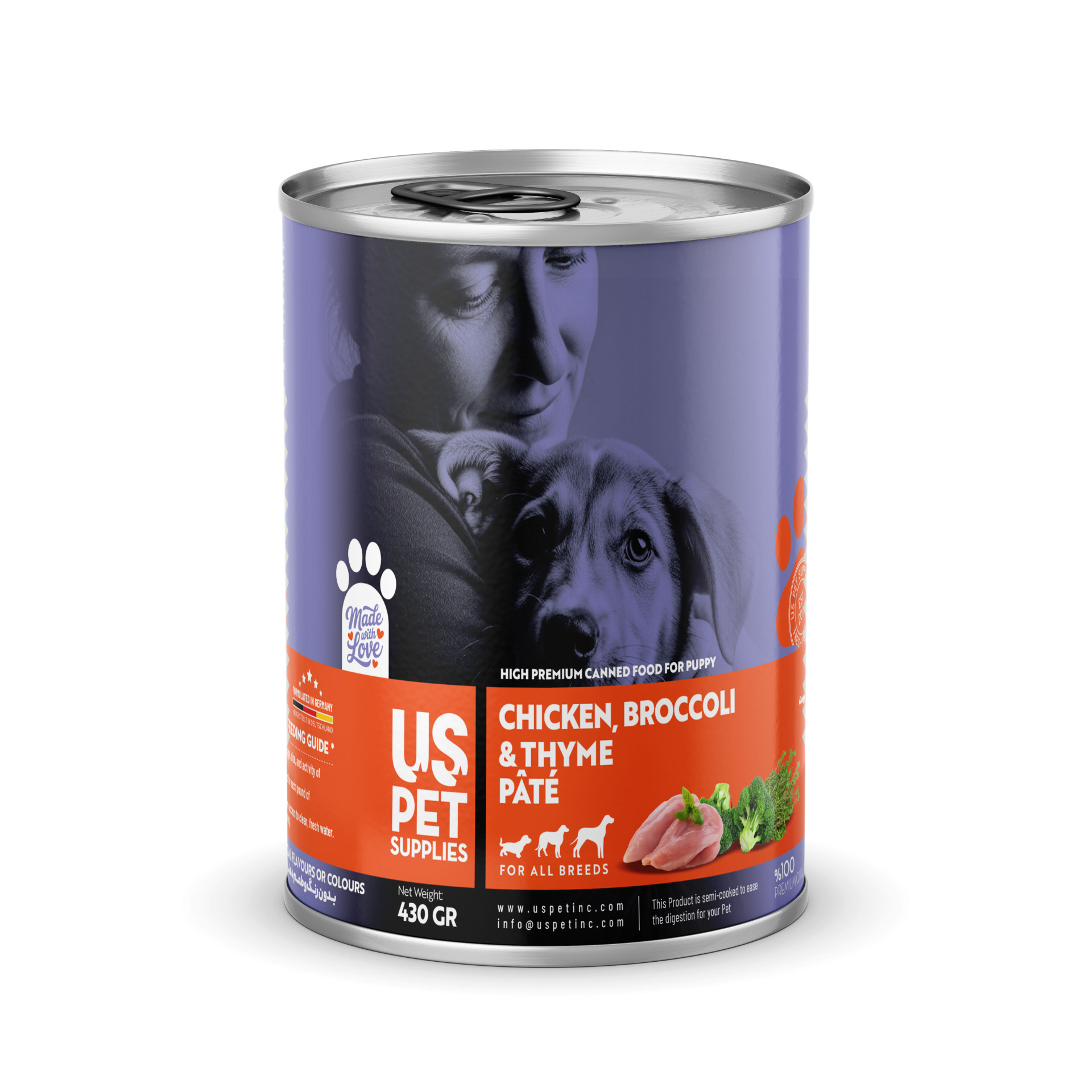 کنسرو غذای توله سگ یو اس پت مدل های پریمیوم با طعم مرغ و بروکلی وزن 430 گرم