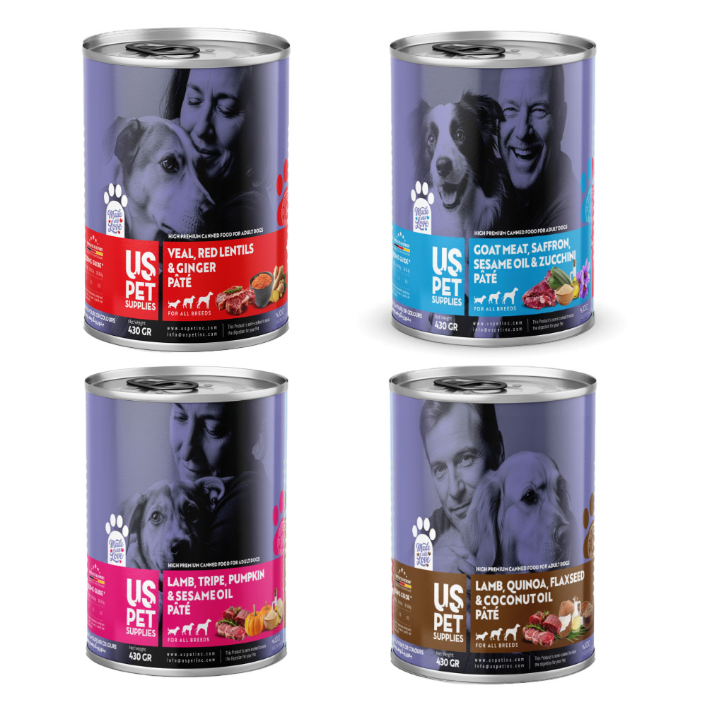 - مجموعه شامل ۴ عدد کنسرو یو اس پت سگ 430 گرمی با طعمهای: