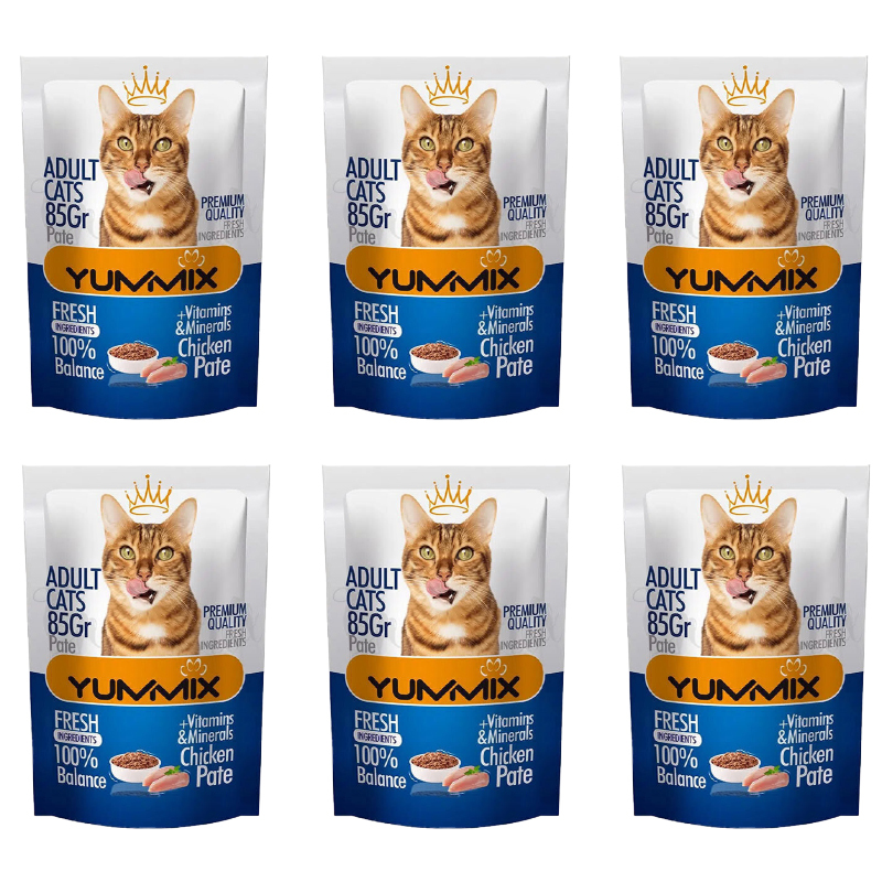 - 6 عدد پوچ گربه بالغ یامیکس مدل پته با طعم مرغ وزن 85 گرم