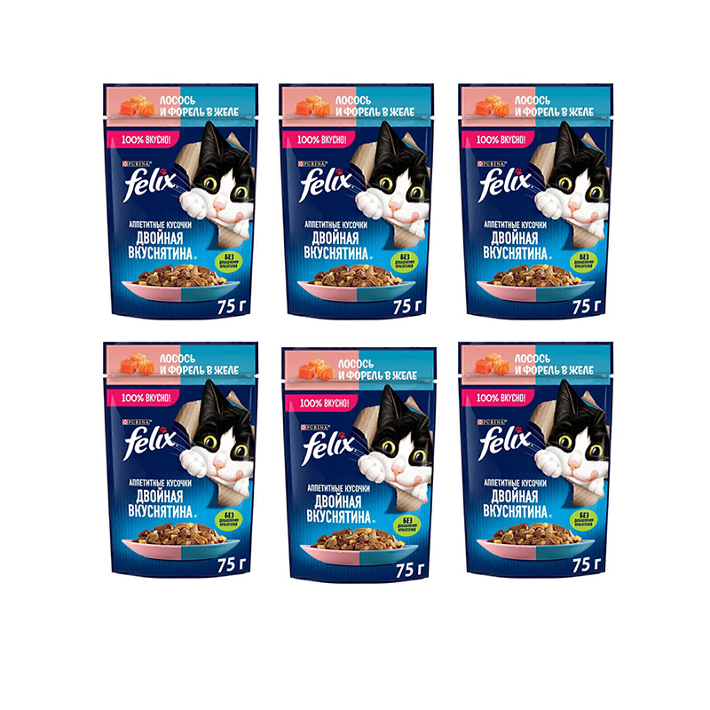 6 عدد پوچ گربه فلیکس با طعم ماهی سالمون و قزلآلا در ژله 75 گرمی