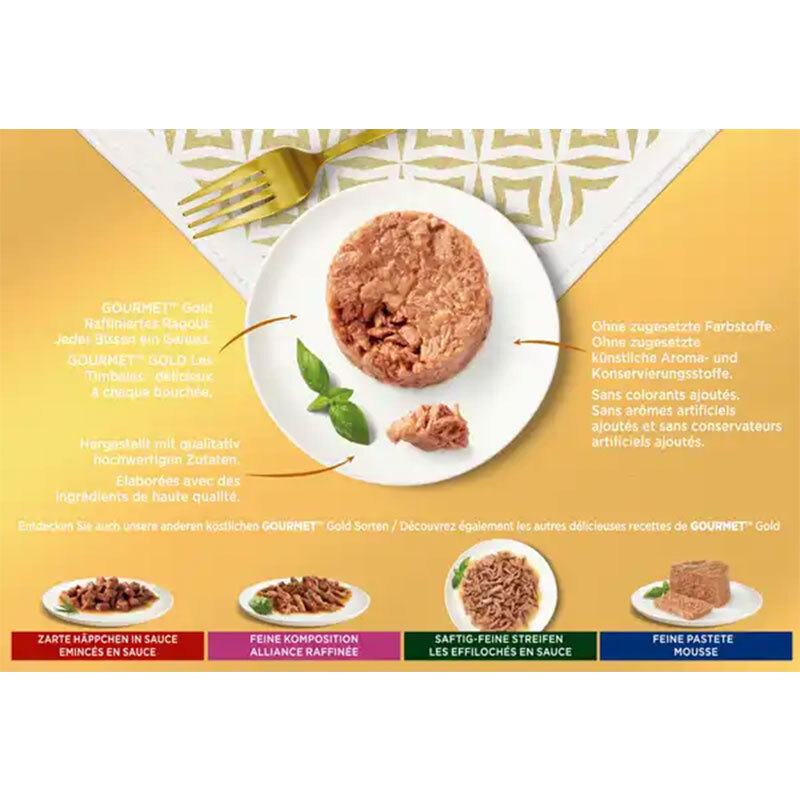 کنسرو گربه گورمت گلد با 4 طعم ماهی تن، قزل آلا، مرغ و گوشت گاو Gourmet Gold Les Timbales بسته 12 عددی