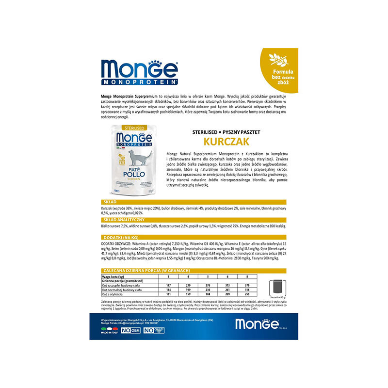 پوچ گربه بالغ عقیم شده مونژ با طعم مرغ Monge Monoprotein Sterilised Cat Pouch وزن 85 گرم