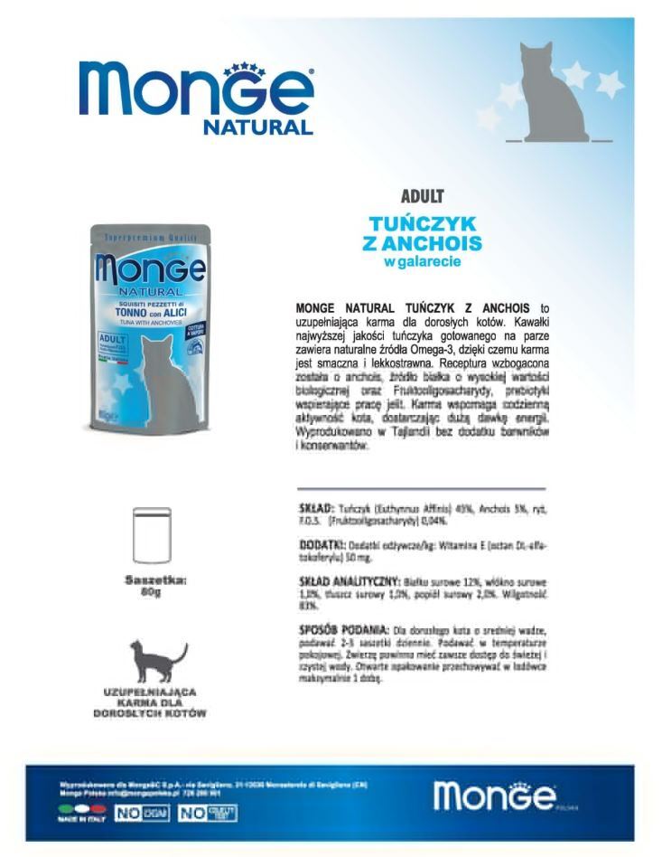 پوچ گربه مونژ با طعم ماهی تن و کولی Monge Natural Cat Pouch وزن 85 گرم