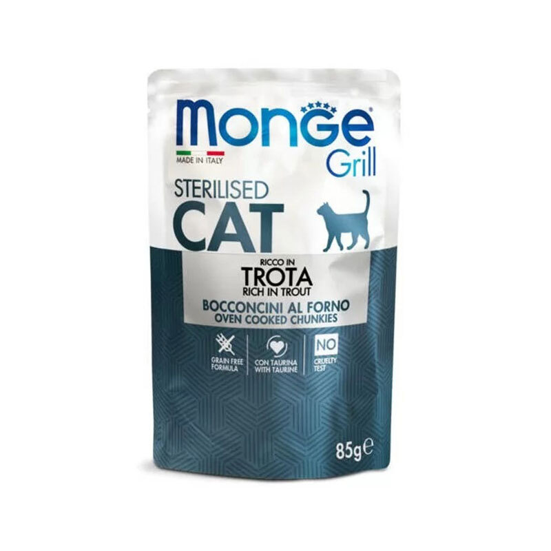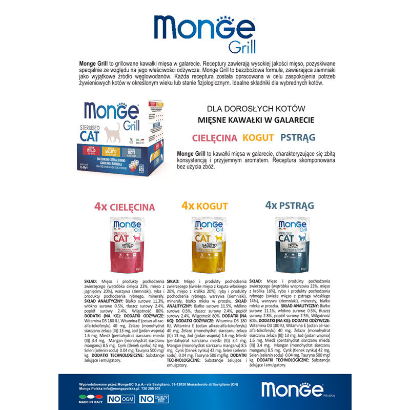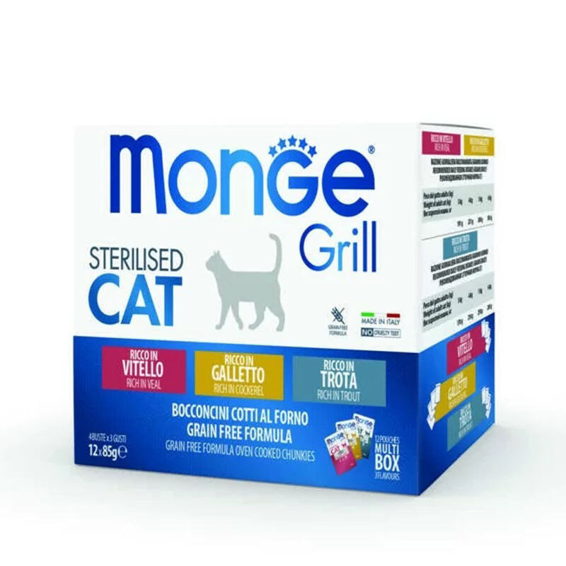 پوچ گربه بالغ عقیم شده مونژ با طعم میکس Monge Grill Multi Box بسته 12 عددی