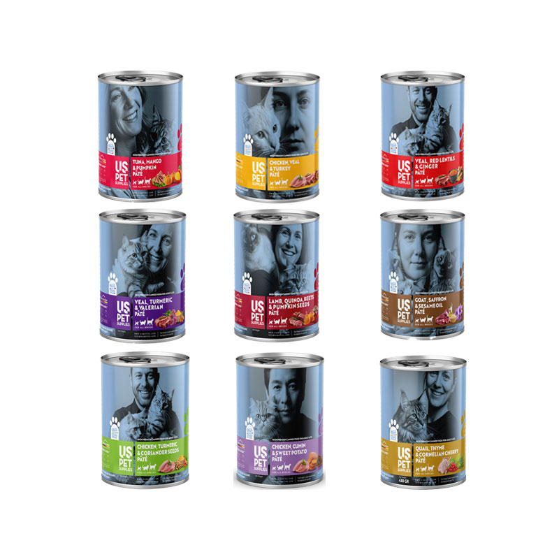- کنسرو غذای گربه یو اس پت مدل های پریمیوم با طعم مرغ و زردچوبه و گشنیز