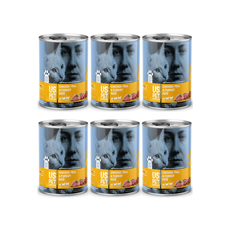 6 عدد کنسرو غذای گربه یو اس پت مدل های پریمیوم با طعم مرغ و گوساله و بوقلمون وزن 800 گرم