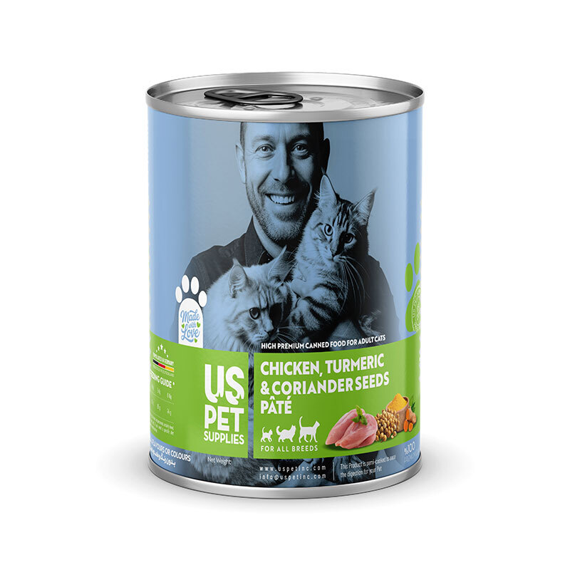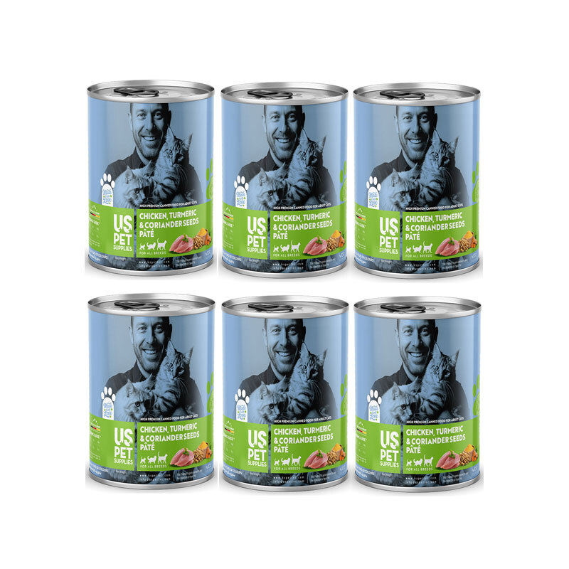 6 عدد کنسرو غذای گربه یو اس پت مدل های پریمیوم با طعم مرغ و زردچوبه و گشنیز وزن 800 گرم