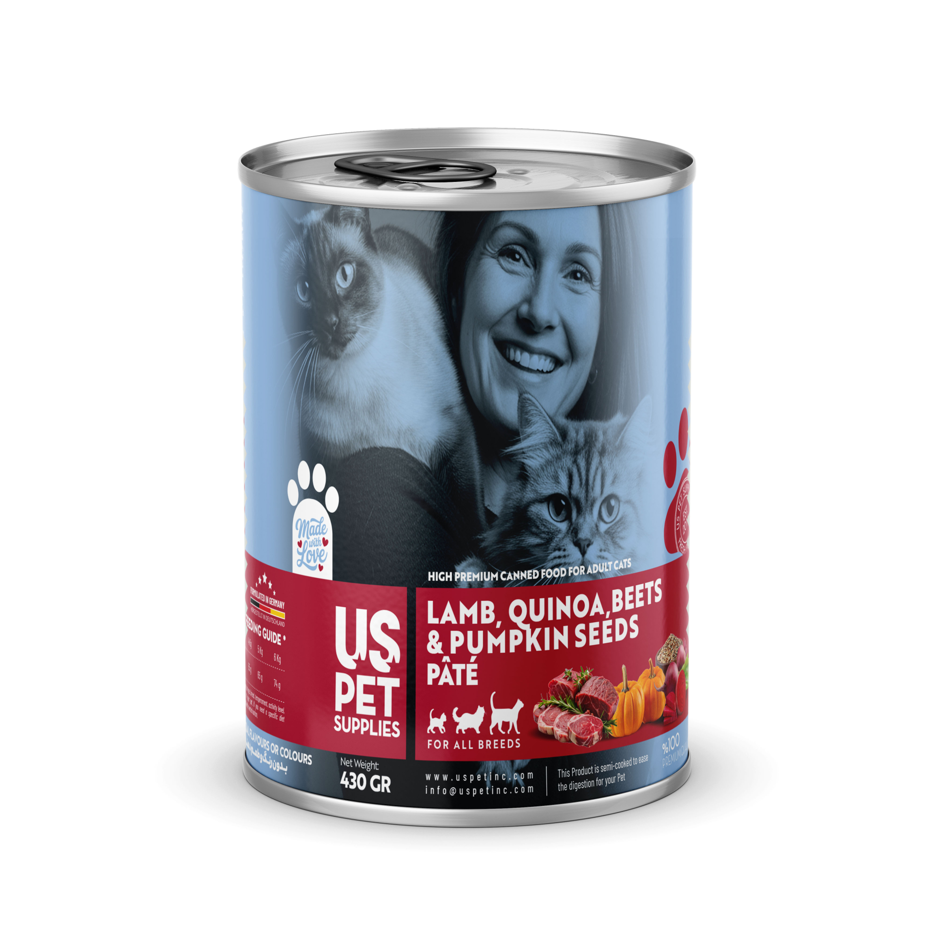 کنسرو غذای گربه یو اس پت مدل های پریمیوم با طعم گوشت بره و کینوآ و چغندر و تخم کدو وزن 430 گرم