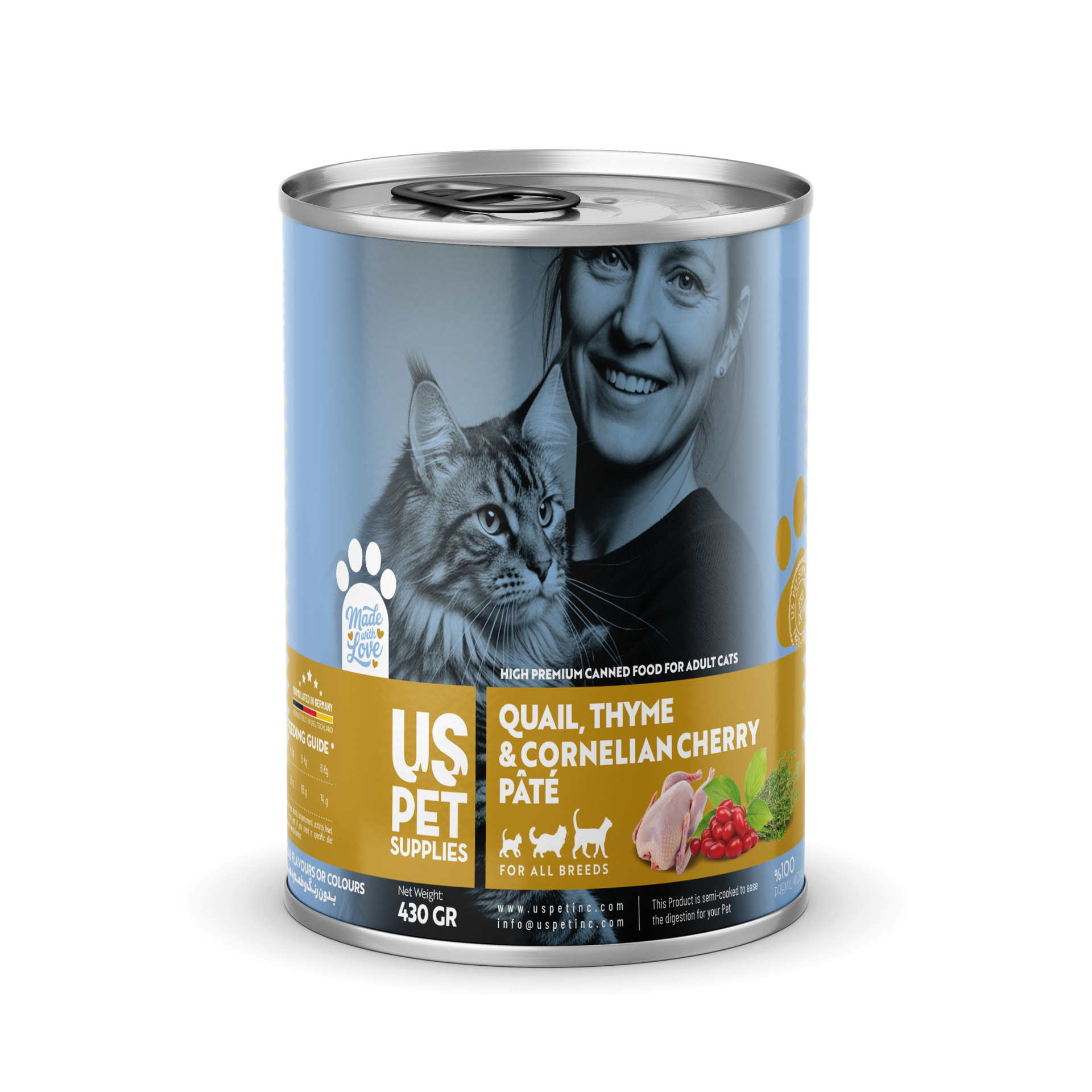 کنسرو غذای گربه یو اس پت مدل های پریمیوم با طعم بلدرچین زغالاخته و آویشن وزن 430 گرم